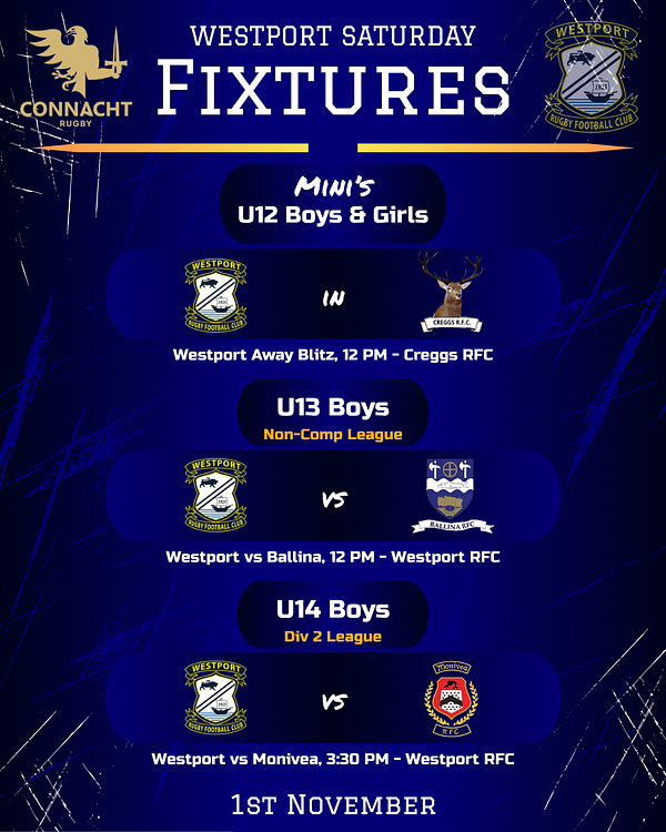 Saturday, November 1st π₯ Miniβs U12 Boys & Girls Blitz β Away in Creggs πͺ Boys U13s (Non-Competitive League) β Home v Ballina β° 12:00 βοΈ Boys U14s (Division 2 League) β Home v Monivea β° 15:30