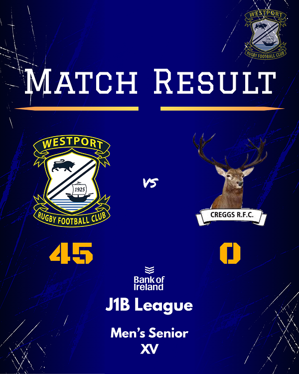 A massive home performance from Westport today as we take a 45β0 win over Creggs 2nds πͺπ From the first whistle to the last, pure grit, work rate and blue pride on display.